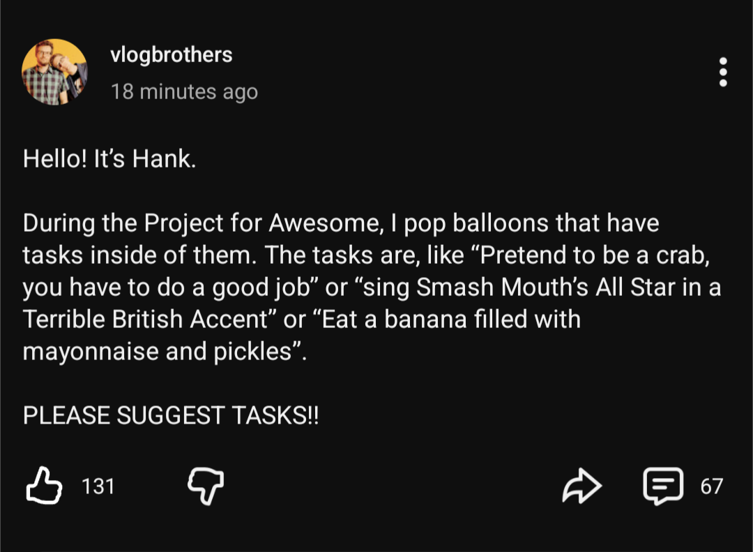 This month features Hank, of course, as he polled the overall Nerdfighter community on some tasks he could hide in balloons that he would have to do as he popped them throughout the stream.