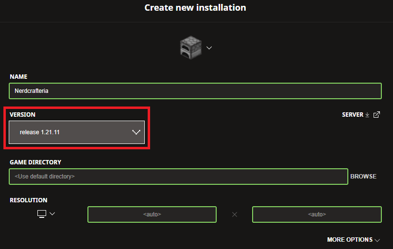 3. Select the release that matches the version Nerdcrafteria is using at the top of this page. In this example, we are selecting release 1.21.11. You can name this installation whatever you like and assign whatever icon you want! We recommend leaving the other settings alone. Create the installation.