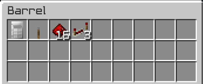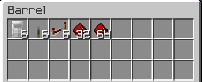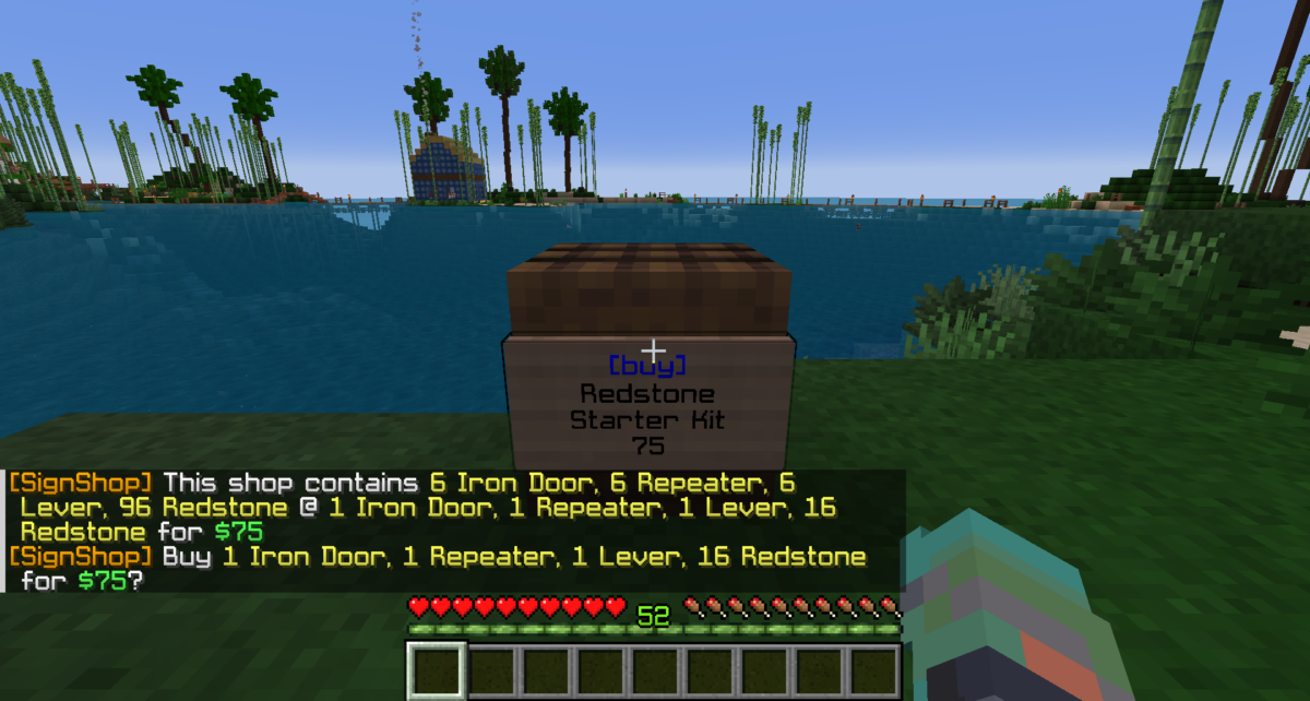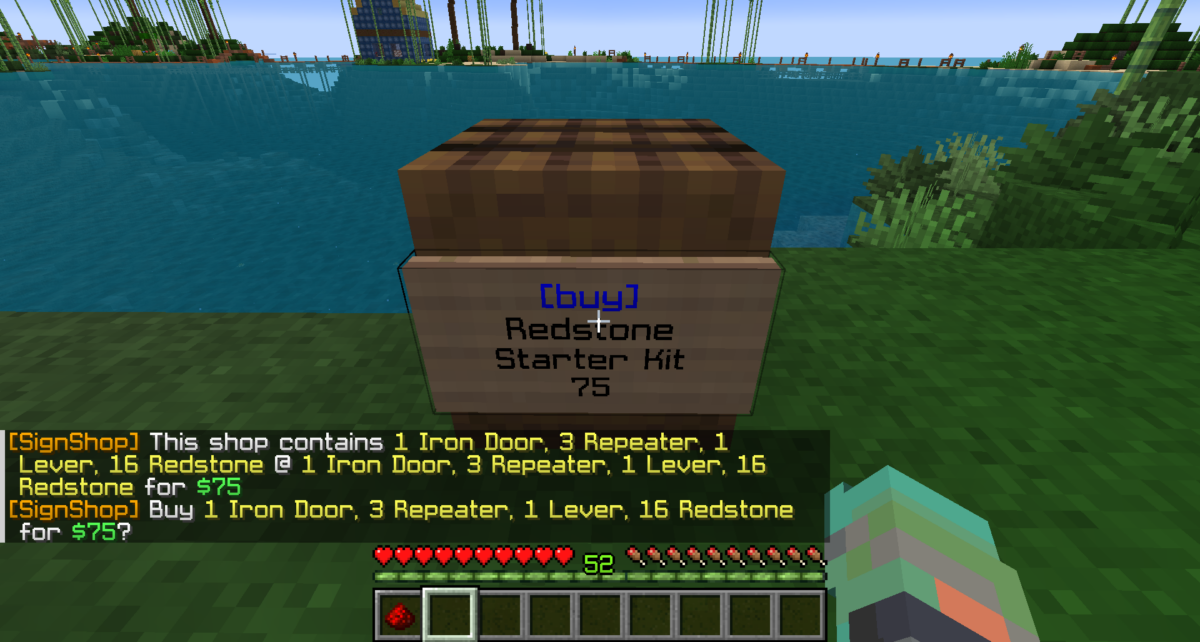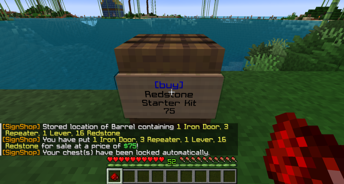 Chest/Barrel with items for a transaction.After punching the barrel with redstone, the barrel with the items is “stored”, and punching the sign with redstone makes the shop and locks the barrel.After punching the shop sign to view the shop’s info, the player can buy 1 Iron Door, 3 Repeaters, 1 Lever, and 16 Redstone for $75.Contents added to the barrel after shop is set up.Shop info changed.