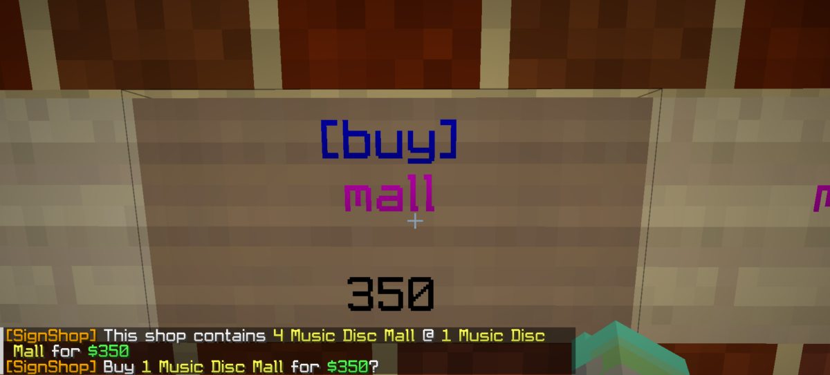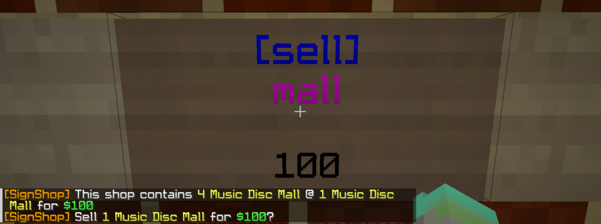 The chest currently has 4 mall music discs.The shop is already set up. Punching the sign to see shop info. The shop contains 4 music discs and for each transaction, the player can buy 1 for $350.Punching the sign to see shop info. The shop contains 4 music discs and for each transaction, the player can sell 1 for $100. This is using the same chest as the buy shop in this case.